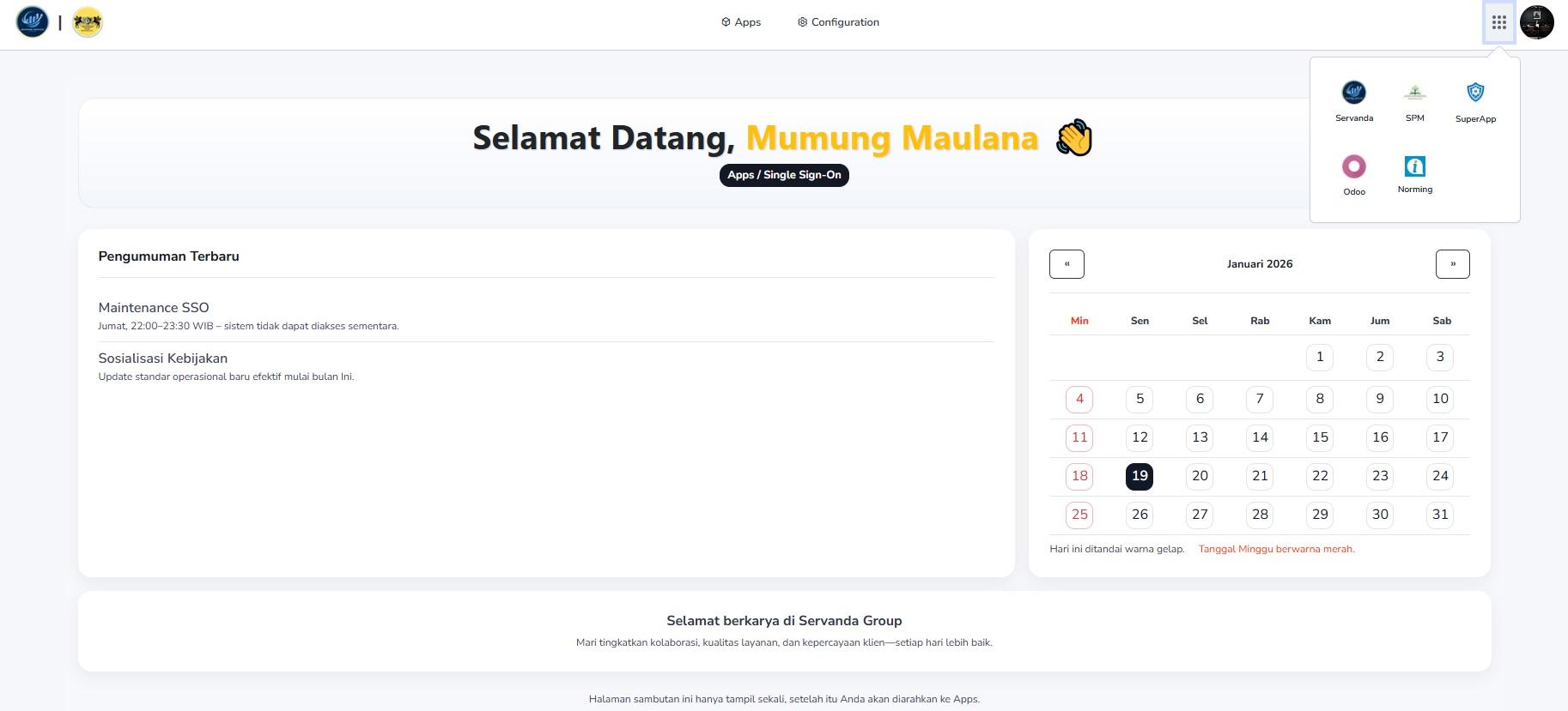 yang menandakan bahwa aplikasi ini terhubung dalam ekosistem Single Sign On (SSO) Servanda.