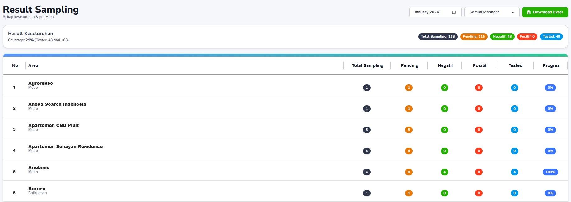 • Coverage (%): Persentase penyelesaian pemeriksaan, yaitu perbandingan antara jumlah sampel yang sudah dites dengan total sampling.
