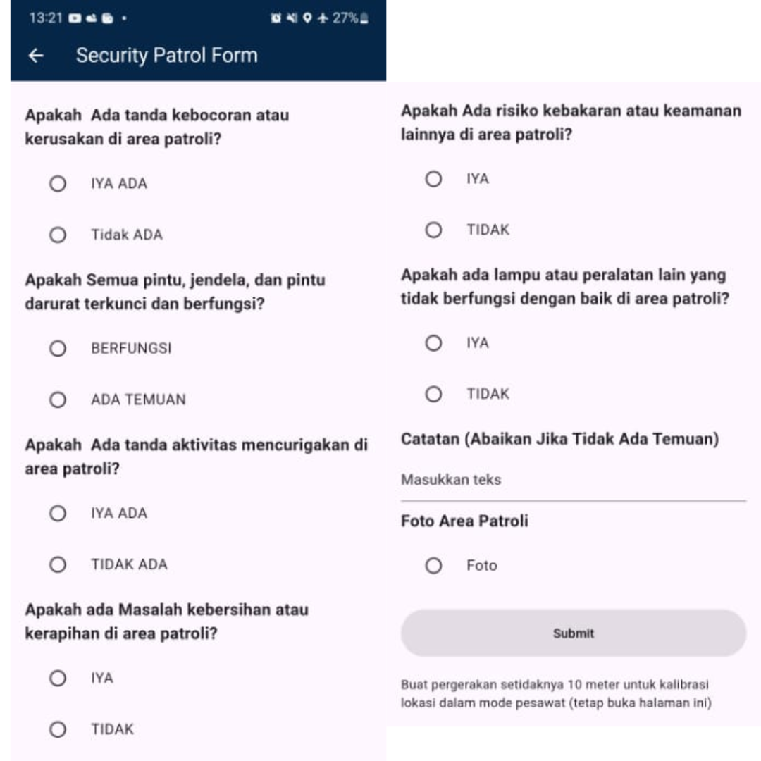 Setelah berhasil melakukan scan pada titik patroli, petugas akan diminta mengisi form pemeriksaan kondisi area. Form ini digunakan untuk mencatat temuan kejadian, kerusakan, atau kondisi tidak normal saat patroli berlangsung.